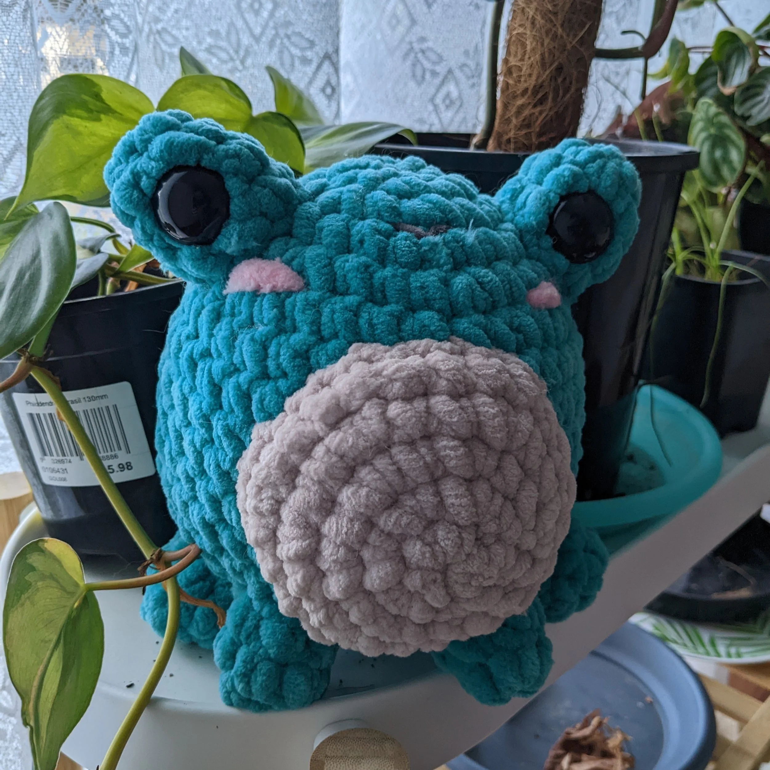 The smaller frogs are made with 8ply acrylic yarn; I personally use the Marvel brand from Spotlight stores in Australia