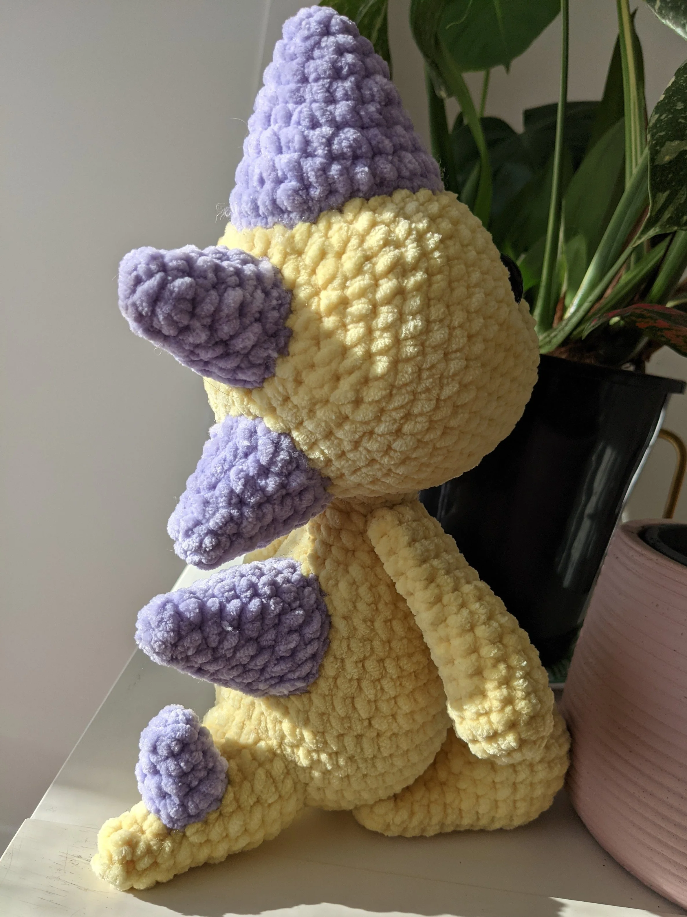 ** The salmon dinosaurs arms are jointed - I don’t have a guide on how to accomplish this yet, but if you want a hand finding a guide please reach out and I’ll help find you one. Note that if you’re using Chenille yarn to make the dino, I would not reccoment jointing with it, a much more stable joint would be using a close coloured acrylic to actually joint the piece.